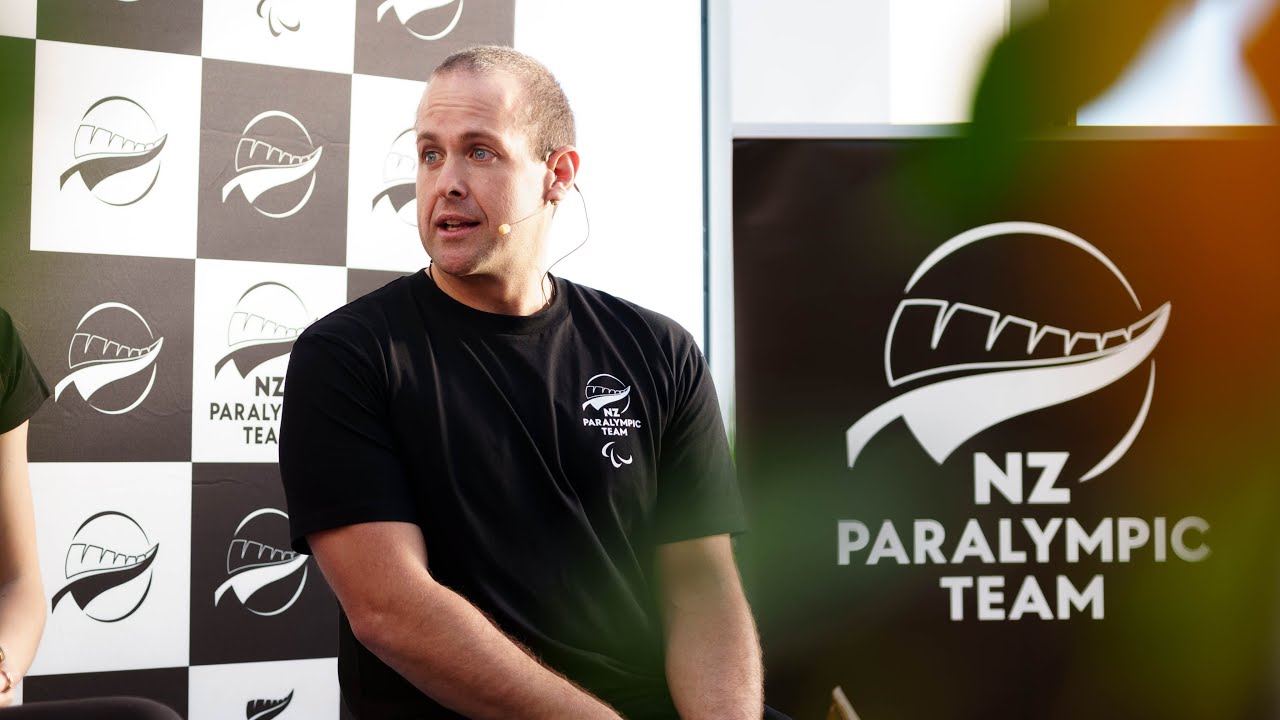 Adam speaks on a panel of NZ Paralympians at an event.